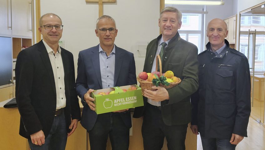 Anlässlich des Tags des Apfels 2025 statteten Vertreter des steirischen Obstbaus bestehend aus Manfred Kohlfürst (Obmann Österreichischer Branchenverband für Obst und Gemüse) und Herbert Muster (Geschäftsführer Verband Steirischer Erwerbsobstbauern) einen Besuch ab.